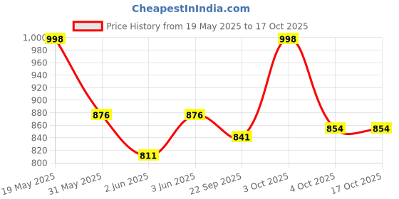 The current price is ₹854, which is ₹43 (5.3%) higher than the best price of ₹811 last seen on 2 Jun 2025. Over the 150 day price history period, prices have ranged from ₹811 to ₹998, with an average of ₹889. The pricing shows moderate volatility, and the overall trend is favorable for consumers as prices are getting cheaper. In terms of recent activity, there have been 0 price changes this week, 2 this month, and 6 over the past year. This is an excellent time to make a purchase as prices are trending downward and conditions appear favorable.