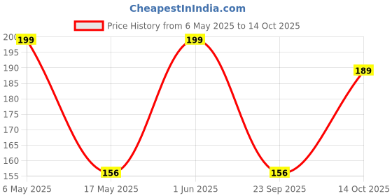The current price is ₹189, which is ₹33 (21.2%) higher than the best price of ₹156 last seen on 17 May 2025. Over the 161 day price history period, prices have ranged from ₹156 to ₹199, with an average of ₹180. The pricing shows moderate volatility, and the overall trend is favorable for consumers as prices are getting cheaper. In terms of recent activity, there have been 0 price changes this week, 1 this month, and 4 over the past year. If you need this product now, it's a reasonable time to buy as prices are stable, but you might want to monitor for potential better deals.