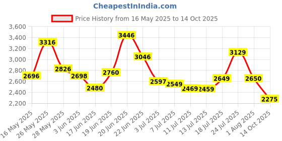 Exciting update! The current price of ₹2,275 is at its best ever level. Over the 151 day price history period, prices have ranged from ₹2,275 to ₹3,446, with an average of ₹2,753. The pricing shows moderate volatility, and the overall trend is favorable for consumers as prices are getting cheaper. In terms of recent activity, there have been 0 price changes this week, 0 this month, and 15 over the past year. This is an excellent time to make a purchase as prices are trending downward and conditions appear favorable.