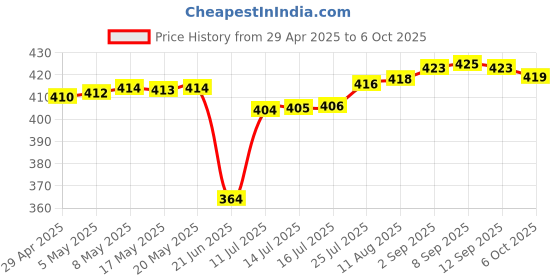 The current price is ₹419, which is ₹55 (15.1%) higher than the best price of ₹364 last seen on 21 Jun 2025. Over the 160 day price history period, prices have ranged from ₹364 to ₹425, with an average of ₹411. The pricing has been quite stable with low volatility, with prices remaining relatively stable overall. In terms of recent activity, there have been 0 price changes this week, 0 this month, and 14 over the past year. If you need this product now, it's a reasonable time to buy as prices are stable, but you might want to monitor for potential better deals.