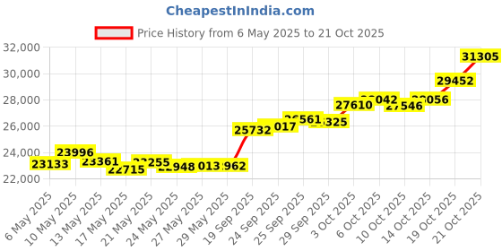 The current price is ₹31,305, which is ₹8,590 (37.8%) higher than the best price of ₹22,715 last seen on 17 May 2025. Over the 168 day price history period, prices have ranged from ₹22,715 to ₹31,305, with an average of ₹25,668. The pricing shows moderate volatility, but the overall trend is concerning as prices are getting more expensive. In terms of recent activity, there has been 1 price change this week, 8 this month, and 17 over the past year. Consider waiting before making a purchase as prices are rising and better deals may be available later.