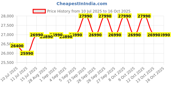 The current price is ₹26,990, which is ₹1,000 (3.8%) higher than the best price of ₹25,990 last seen on 11 Jul 2025. Over the 98 day price history period, prices have ranged from ₹25,990 to ₹27,990, with an average of ₹27,128. The pricing has been quite stable with low volatility, with prices remaining relatively stable overall. In terms of recent activity, there has been 1 price change this week, 7 this month, and 14 over the past year. The price direction is uncertain, so monitor the situation for a few more days before making a decision.