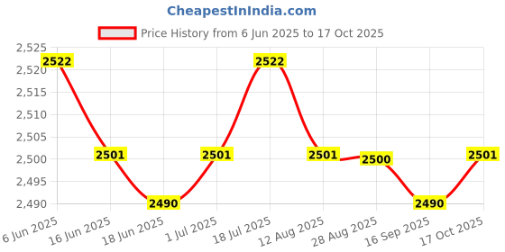 The current price is ₹2,501, which is ₹11 (0.4%) higher than the best price of ₹2,490 last seen on 18 Jun 2025. Over the 133 day price history period, prices have ranged from ₹2,490 to ₹2,522, with an average of ₹2,503. The pricing has been quite stable with low volatility, with prices remaining relatively stable overall. In terms of recent activity, there have been 0 price changes this week, 0 this month, and 8 over the past year. If you need this product now, it's a reasonable time to buy as prices are stable, but you might want to monitor for potential better deals.