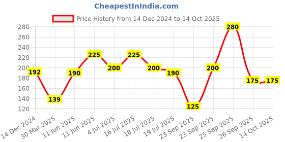 The current price is ₹175, which is ₹50 (40.0%) higher than the best price of ₹125 last seen on 23 Sep 2025. Over the 303 day price history period, prices have ranged from ₹125 to ₹280, with an average of ₹194. The pricing shows high volatility with significant fluctuations, and the overall trend is favorable for consumers as prices are getting cheaper. In terms of recent activity, there have been 0 price changes this week, 3 this month, and 11 over the past year. This is an excellent time to make a purchase as prices are trending downward and conditions appear favorable.