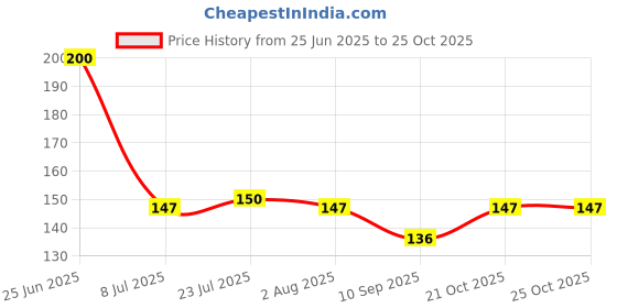 The current price is ₹147, which is ₹11 (8.1%) higher than the best price of ₹136 last seen on 10 Sep 2025. Over the 121 day price history period, prices have ranged from ₹136 to ₹200, with an average of ₹153. The pricing shows moderate volatility, and the overall trend is favorable for consumers as prices are getting cheaper. In terms of recent activity, there have been 0 price changes this week, 0 this month, and 5 over the past year. If you need this product now, it's a reasonable time to buy as prices are stable, but you might want to monitor for potential better deals.