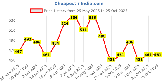 The current price is ₹461, which is ₹10 (2.2%) higher than the best price of ₹451 last seen on 21 Sep 2025. Over the 152 day price history period, prices have ranged from ₹451 to ₹536, with an average of ₹485. The pricing shows moderate volatility, with prices remaining relatively stable overall. In terms of recent activity, there have been 0 price changes this week, 3 this month, and 14 over the past year. If you need this product now, it's a reasonable time to buy as prices are stable, but you might want to monitor for potential better deals.