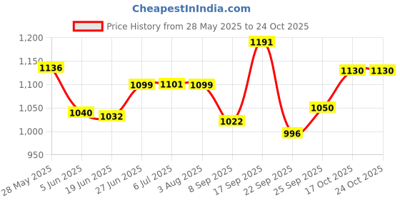 The current price is ₹1,130, which is ₹134 (13.5%) higher than the best price of ₹996 last seen on 22 Sep 2025. Over the 149 day price history period, prices have ranged from ₹996 to ₹1,191, with an average of ₹1,086. The pricing shows moderate volatility, with prices remaining relatively stable overall. In terms of recent activity, there have been 0 price changes this week, 1 this month, and 10 over the past year. If you need this product now, it's a reasonable time to buy as prices are stable, but you might want to monitor for potential better deals.