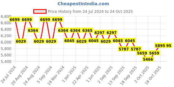 The current price is ₹5,895, which is ₹428.76 (7.8%) higher than the best price of ₹5,466.24 last seen on 2 Oct 2025. Over the 457 day price history period, prices have ranged from ₹5,466.24 to ₹6,699, with an average of ₹6,128. The pricing shows moderate volatility, and the overall trend is favorable for consumers as prices are getting cheaper. In terms of recent activity, there have been 0 price changes this week, 2 this month, and 17 over the past year. The price direction is uncertain, so monitor the situation for a few more days before making a decision.
