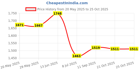 The current price is ₹1,511, which is ₹48 (3.3%) higher than the best price of ₹1,463 last seen on 8 Jul 2025. Over the 154 day price history period, prices have ranged from ₹1,463 to ₹1,748, with an average of ₹1,597. The pricing shows moderate volatility, and the overall trend is favorable for consumers as prices are getting cheaper. In terms of recent activity, there have been 0 price changes this week, 0 this month, and 5 over the past year. If you need this product now, it's a reasonable time to buy as prices are stable, but you might want to monitor for potential better deals.
