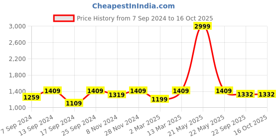 The current price is ₹1,332, which is ₹223 (20.1%) higher than the best price of ₹1,109 last seen on 17 Sep 2024. Over the 404 day price history period, prices have ranged from ₹1,109 to ₹2,999, with an average of ₹1,466. The pricing shows high volatility with significant fluctuations, but the overall trend is concerning as prices are getting more expensive. In terms of recent activity, there have been 0 price changes this week, 0 this month, and 6 over the past year. If you need this product now, it's a reasonable time to buy as prices are stable, but you might want to monitor for potential better deals.