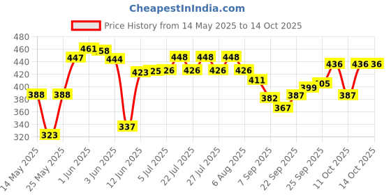 The current price is ₹436, which is ₹113 (35.0%) higher than the best price of ₹323 last seen on 17 May 2025. Over the 152 day price history period, prices have ranged from ₹323 to ₹461, with an average of ₹414. The pricing shows moderate volatility, but the overall trend is concerning as prices are getting more expensive. In terms of recent activity, there has been 1 price change this week, 6 this month, and 25 over the past year. If you need this product now, it's a reasonable time to buy as prices are stable, but you might want to monitor for potential better deals.
