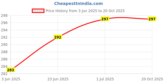 The current price is ₹297, which is ₹14 (4.9%) higher than the best price of ₹283 last seen on 3 Jun 2025. Over the 137 day price history period, prices have ranged from ₹283 to ₹297, with an average of ₹292. The pricing has been quite stable with low volatility, with prices remaining relatively stable overall. In terms of recent activity, there have been 0 price changes this week, 0 this month, and 2 over the past year. If you need this product now, it's a reasonable time to buy as prices are stable, but you might want to monitor for potential better deals.