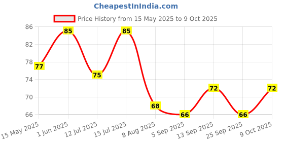 The current price is ₹72, which is ₹6 (9.1%) higher than the best price of ₹66 last seen on 5 Sep 2025. Over the 147 day price history period, prices have ranged from ₹66 to ₹85, with an average of ₹74. The pricing shows moderate volatility, and the overall trend is favorable for consumers as prices are getting cheaper. In terms of recent activity, there have been 0 price changes this week, 1 this month, and 8 over the past year. If you need this product now, it's a reasonable time to buy as prices are stable, but you might want to monitor for potential better deals.