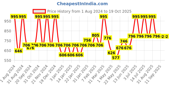 The current price is ₹792, which is ₹215 (37.3%) higher than the best price of ₹577 last seen on 8 May 2025. Over the 443 day price history period, prices have ranged from ₹577 to ₹995, with an average of ₹778. The pricing shows high volatility with significant fluctuations, and the overall trend is favorable for consumers as prices are getting cheaper. In terms of recent activity, there have been 0 price changes this week, 0 this month, and 30 over the past year. If you need this product now, it's a reasonable time to buy as prices are stable, but you might want to monitor for potential better deals.