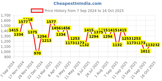 The current price is ₹1,132, which is ₹162 (16.7%) higher than the best price of ₹970 last seen on 7 Dec 2024. Over the 404 day price history period, prices have ranged from ₹970 to ₹1,618, with an average of ₹1,298. The pricing shows moderate volatility, and the overall trend is favorable for consumers as prices are getting cheaper. In terms of recent activity, there have been 0 price changes this week, 2 this month, and 27 over the past year. The price direction is uncertain, so monitor the situation for a few more days before making a decision.