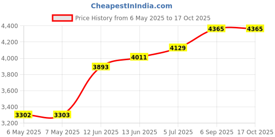 The current price is ₹4,365, which is ₹1,062.18 (32.2%) higher than the best price of ₹3,302.82 last seen on 6 May 2025. Over the 163 day price history period, prices have ranged from ₹3,302.82 to ₹4,365, with an average of ₹3,910. The pricing shows moderate volatility, but the overall trend is concerning as prices are getting more expensive. In terms of recent activity, there have been 0 price changes this week, 0 this month, and 5 over the past year. Consider waiting before making a purchase as prices are rising and better deals may be available later.