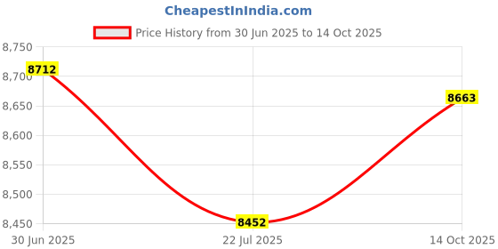 The current price is ₹8,663, which is ₹211 (2.5%) higher than the best price of ₹8,452 last seen on 22 Jul 2025. Over the 106 day price history period, prices have ranged from ₹8,452 to ₹8,712, with an average of ₹8,609. The pricing has been quite stable with low volatility, with prices remaining relatively stable overall. In terms of recent activity, there have been 0 price changes this week, 0 this month, and 2 over the past year. If you need this product now, it's a reasonable time to buy as prices are stable, but you might want to monitor for potential better deals.