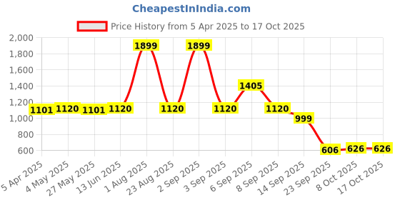 The current price is ₹626, which is ₹20 (3.3%) higher than the best price of ₹606 last seen on 23 Sep 2025. Over the 194 day price history period, prices have ranged from ₹606 to ₹1,899, with an average of ₹1,133. The pricing shows high volatility with significant fluctuations, and the overall trend is favorable for consumers as prices are getting cheaper. In terms of recent activity, there have been 0 price changes this week, 1 this month, and 12 over the past year. If you need this product now, it's a reasonable time to buy as prices are stable, but you might want to monitor for potential better deals.