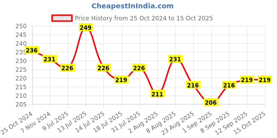 The current price is ₹219, which is ₹13 (6.3%) higher than the best price of ₹206 last seen on 1 Sep 2025. Over the 354 day price history period, prices have ranged from ₹206 to ₹249, with an average of ₹224. The pricing has been quite stable with low volatility, and the overall trend is favorable for consumers as prices are getting cheaper. In terms of recent activity, there have been 0 price changes this week, 0 this month, and 12 over the past year. If you need this product now, it's a reasonable time to buy as prices are stable, but you might want to monitor for potential better deals.