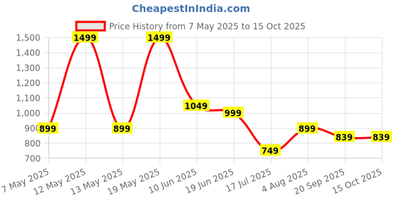 The current price is ₹839.5, which is ₹90 (12.0%) higher than the best price of ₹749.5 last seen on 17 Jul 2025. Over the 161 day price history period, prices have ranged from ₹749.5 to ₹1,499, with an average of ₹1,017. The pricing shows high volatility with significant fluctuations, and the overall trend is favorable for consumers as prices are getting cheaper. In terms of recent activity, there have been 0 price changes this week, 0 this month, and 8 over the past year. If you need this product now, it's a reasonable time to buy as prices are stable, but you might want to monitor for potential better deals.