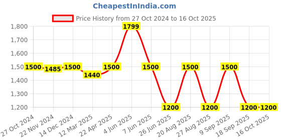 Great news for shoppers! The current price of ₹1,200 is at its best ever level. Over the 354 day price history period, prices have ranged from ₹1,200 to ₹1,799, with an average of ₹1,425. The pricing shows moderate volatility, and the overall trend is favorable for consumers as prices are getting cheaper. In terms of recent activity, there have been 0 price changes this week, 0 this month, and 11 over the past year. This is an excellent time to make a purchase as prices are trending downward and conditions appear favorable.