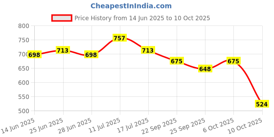 Exciting update! The current price of ₹524 is at its best ever level. Over the 118 day price history period, prices have ranged from ₹524 to ₹757, with an average of ₹678. The pricing shows moderate volatility, and the overall trend is favorable for consumers as prices are getting cheaper. In terms of recent activity, there have been 0 price changes this week, 3 this month, and 8 over the past year. This is an excellent time to make a purchase as prices are trending downward and conditions appear favorable.