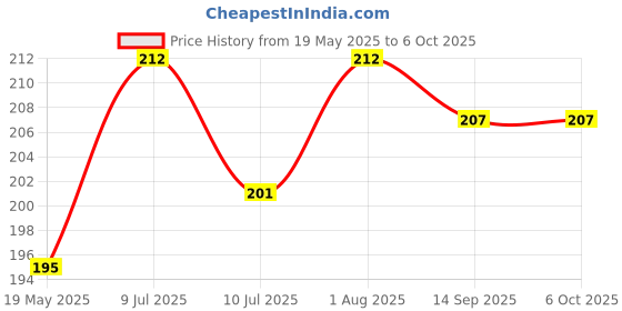 The current price is ₹207, which is ₹12 (6.2%) higher than the best price of ₹195 last seen on 19 May 2025. Over the 139 day price history period, prices have ranged from ₹195 to ₹212, with an average of ₹206. The pricing has been quite stable with low volatility, but the overall trend is concerning as prices are getting more expensive. In terms of recent activity, there have been 0 price changes this week, 0 this month, and 4 over the past year. If you need this product now, it's a reasonable time to buy as prices are stable, but you might want to monitor for potential better deals.
