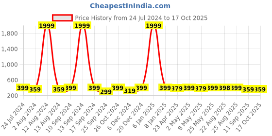 The current price is ₹359, which is ₹60 (20.1%) higher than the best price of ₹299 last seen on 25 Sep 2024. Over the 449 day price history period, prices have ranged from ₹299 to ₹1,999, with an average of ₹609. The pricing shows high volatility with significant fluctuations, and the overall trend is favorable for consumers as prices are getting cheaper. In terms of recent activity, there have been 0 price changes this week, 0 this month, and 11 over the past year. If you need this product now, it's a reasonable time to buy as prices are stable, but you might want to monitor for potential better deals.