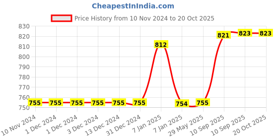 The current price is ₹823, which is ₹68.35 (9.1%) higher than the best price of ₹754.65 last seen on 7 Jan 2025. Over the 342 day price history period, prices have ranged from ₹754.65 to ₹823, with an average of ₹777. The pricing has been quite stable with low volatility, but the overall trend is concerning as prices are getting more expensive. In terms of recent activity, there have been 0 price changes this week, 0 this month, and 10 over the past year. If you need this product now, it's a reasonable time to buy as prices are stable, but you might want to monitor for potential better deals.
