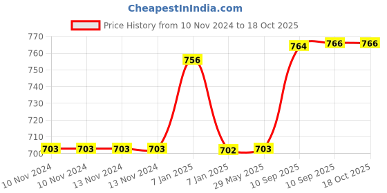 The current price is ₹766, which is ₹63.85 (9.1%) higher than the best price of ₹702.15 last seen on 7 Jan 2025. Over the 342 day price history period, prices have ranged from ₹702.15 to ₹766, with an average of ₹727. The pricing has been quite stable with low volatility, but the overall trend is concerning as prices are getting more expensive. In terms of recent activity, there have been 0 price changes this week, 0 this month, and 8 over the past year. If you need this product now, it's a reasonable time to buy as prices are stable, but you might want to monitor for potential better deals.