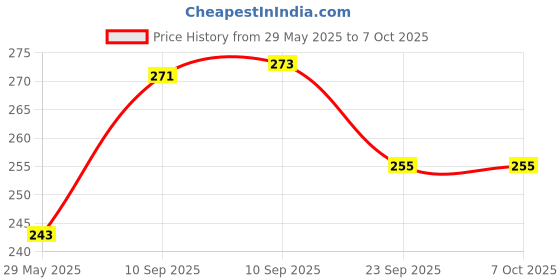 The current price is ₹255, which is ₹12 (4.9%) higher than the best price of ₹243 last seen on 29 May 2025. Over the 130 day price history period, prices have ranged from ₹243 to ₹273, with an average of ₹259. The pricing has been quite stable with low volatility, with prices remaining relatively stable overall. In terms of recent activity, there have been 0 price changes this week, 2 this month, and 3 over the past year. If you need this product now, it's a reasonable time to buy as prices are stable, but you might want to monitor for potential better deals.