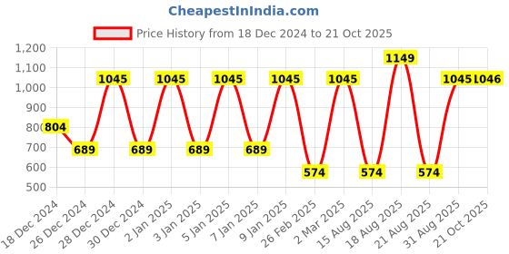 The current price is ₹1,046, which is ₹472 (82.2%) higher than the best price of ₹574 last seen on 26 Feb 2025. Over the 307 day price history period, prices have ranged from ₹574 to ₹1,149, with an average of ₹859. The pricing shows high volatility with significant fluctuations, but the overall trend is concerning as prices are getting more expensive. In terms of recent activity, there have been 0 price changes this week, 0 this month, and 15 over the past year. Consider waiting before making a purchase as prices are rising and better deals may be available later.