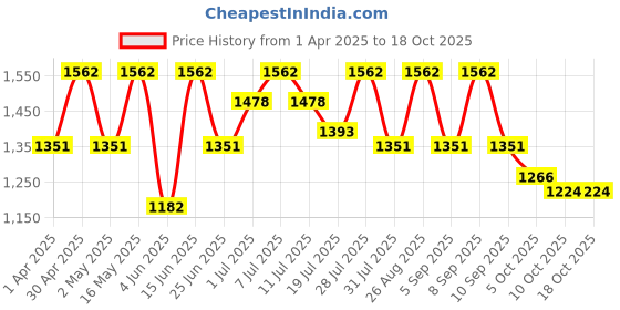 The current price is ₹1,224, which is ₹42 (3.6%) higher than the best price of ₹1,182 last seen on 4 Jun 2025. Over the 200 day price history period, prices have ranged from ₹1,182 to ₹1,562, with an average of ₹1,414. The pricing shows moderate volatility, and the overall trend is favorable for consumers as prices are getting cheaper. In terms of recent activity, there have been 0 price changes this week, 1 this month, and 18 over the past year. If you need this product now, it's a reasonable time to buy as prices are stable, but you might want to monitor for potential better deals.