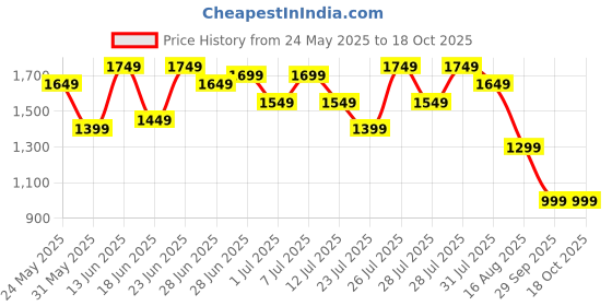Exciting update! The current price of ₹999 is at its best ever level. Over the 147 day price history period, prices have ranged from ₹999 to ₹1,749, with an average of ₹1,530. The pricing shows high volatility with significant fluctuations, and the overall trend is favorable for consumers as prices are getting cheaper. In terms of recent activity, there have been 0 price changes this week, 0 this month, and 16 over the past year. This is an excellent time to make a purchase as prices are trending downward and conditions appear favorable.