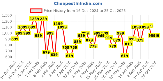 The current price is ₹959, which is ₹340 (54.9%) higher than the best price of ₹619 last seen on 6 Apr 2025. Over the 312 day price history period, prices have ranged from ₹619 to ₹1,239, with an average of ₹938. The pricing shows high volatility with significant fluctuations, but the overall trend is concerning as prices are getting more expensive. In terms of recent activity, there have been 0 price changes this week, 0 this month, and 35 over the past year. The price direction is uncertain, so monitor the situation for a few more days before making a decision.