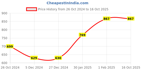 The current price is ₹867, which is ₹238 (37.8%) higher than the best price of ₹629 last seen on 5 Dec 2024. Over the 355 day price history period, prices have ranged from ₹629 to ₹867, with an average of ₹744. The pricing shows moderate volatility, but the overall trend is concerning as prices are getting more expensive. In terms of recent activity, there have been 0 price changes this week, 0 this month, and 4 over the past year. If you need this product now, it's a reasonable time to buy as prices are stable, but you might want to monitor for potential better deals.