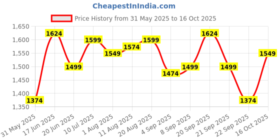 The current price is ₹1,549, which is ₹175 (12.7%) higher than the best price of ₹1,374 last seen on 31 May 2025. Over the 138 day price history period, prices have ranged from ₹1,374 to ₹1,624, with an average of ₹1,526. The pricing shows moderate volatility, but the overall trend is concerning as prices are getting more expensive. In terms of recent activity, there have been 0 price changes this week, 3 this month, and 12 over the past year. If you need this product now, it's a reasonable time to buy as prices are stable, but you might want to monitor for potential better deals.