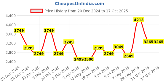 The current price is ₹3,265, which is ₹766 (30.7%) higher than the best price of ₹2,499 last seen on 2 Apr 2025. Over the 300 day price history period, prices have ranged from ₹2,499 to ₹4,213, with an average of ₹3,095. The pricing shows high volatility with significant fluctuations, and the overall trend is favorable for consumers as prices are getting cheaper. In terms of recent activity, there have been 0 price changes this week, 1 this month, and 13 over the past year. This is an excellent time to make a purchase as prices are trending downward and conditions appear favorable.