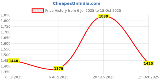 The current price is ₹1,425, which is ₹46 (3.3%) higher than the best price of ₹1,379 last seen on 6 Aug 2025. Over the 101 day price history period, prices have ranged from ₹1,379 to ₹1,839, with an average of ₹1,523. The pricing shows moderate volatility, with prices remaining relatively stable overall. In terms of recent activity, there have been 0 price changes this week, 1 this month, and 3 over the past year. If you need this product now, it's a reasonable time to buy as prices are stable, but you might want to monitor for potential better deals.