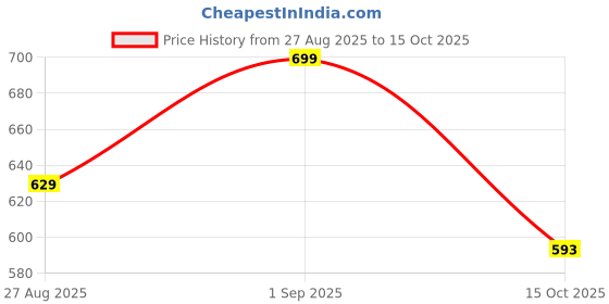 Fantastic! The current price of ₹593 is at its best ever level. Over the 49 day price history period, prices have ranged from ₹593 to ₹699, with an average of ₹640. The pricing shows moderate volatility, and the overall trend is favorable for consumers as prices are getting cheaper. In terms of recent activity, there have been 0 price changes this week, 0 this month, and 2 over the past year. If you need this product now, it's a reasonable time to buy as prices are stable, but you might want to monitor for potential better deals.