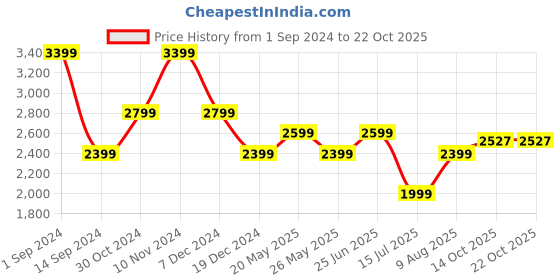 The current price is ₹2,527, which is ₹528 (26.4%) higher than the best price of ₹1,999 last seen on 15 Jul 2025. Over the 415 day price history period, prices have ranged from ₹1,999 to ₹3,399, with an average of ₹2,634. The pricing shows moderate volatility, and the overall trend is favorable for consumers as prices are getting cheaper. In terms of recent activity, there have been 0 price changes this week, 0 this month, and 9 over the past year. The price direction is uncertain, so monitor the situation for a few more days before making a decision.