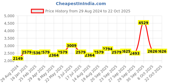 The current price is ₹2,626, which is ₹477 (22.2%) higher than the best price of ₹2,149 last seen on 29 Aug 2024. Over the 418 day price history period, prices have ranged from ₹2,149 to ₹4,529, with an average of ₹2,682. The pricing shows high volatility with significant fluctuations, but the overall trend is concerning as prices are getting more expensive. In terms of recent activity, there have been 0 price changes this week, 4 this month, and 14 over the past year. The price direction is uncertain, so monitor the situation for a few more days before making a decision.