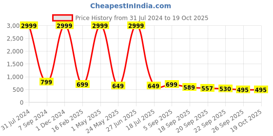 Good news! The current price of ₹495 is at its best ever level. Over the 444 day price history period, prices have ranged from ₹495 to ₹2,999, with an average of ₹1,297. The pricing shows high volatility with significant fluctuations, and the overall trend is favorable for consumers as prices are getting cheaper. In terms of recent activity, there have been 0 price changes this week, 2 this month, and 10 over the past year. If you need this product now, it's a reasonable time to buy as prices are stable, but you might want to monitor for potential better deals.