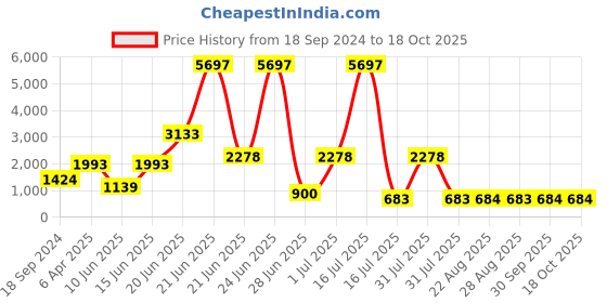 The current price is ₹684, which is ₹1 (0.1%) higher than the best price of ₹683 last seen on 16 Jul 2025. Over the 395 day price history period, prices have ranged from ₹683 to ₹5,697, with an average of ₹2,145. The pricing shows high volatility with significant fluctuations, and the overall trend is favorable for consumers as prices are getting cheaper. In terms of recent activity, there have been 0 price changes this week, 0 this month, and 15 over the past year. If you need this product now, it's a reasonable time to buy as prices are stable, but you might want to monitor for potential better deals.