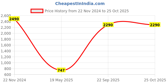 The current price is ₹2,290, which is ₹1,543 (206.6%) higher than the best price of ₹747 last seen on 19 May 2025. Over the 336 day price history period, prices have ranged from ₹747 to ₹2,490, with an average of ₹1,954. The pricing shows high volatility with significant fluctuations, and the overall trend is favorable for consumers as prices are getting cheaper. In terms of recent activity, there have been 0 price changes this week, 0 this month, and 2 over the past year. The price direction is uncertain, so monitor the situation for a few more days before making a decision.
