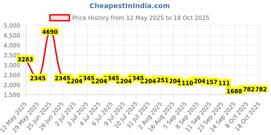 The current price is ₹1,782, which is ₹94 (5.6%) higher than the best price of ₹1,688 last seen on 24 Sep 2025. Over the 159 day price history period, prices have ranged from ₹1,688 to ₹4,690, with an average of ₹2,340. The pricing shows high volatility with significant fluctuations, and the overall trend is favorable for consumers as prices are getting cheaper. In terms of recent activity, there have been 0 price changes this week, 2 this month, and 18 over the past year. If you need this product now, it's a reasonable time to buy as prices are stable, but you might want to monitor for potential better deals.
