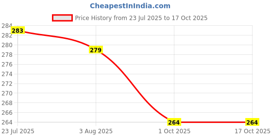 Fantastic! The current price of ₹264 is at its best ever level. Over the 85 day price history period, prices have ranged from ₹264 to ₹283, with an average of ₹273. The pricing has been quite stable with low volatility, and the overall trend is favorable for consumers as prices are getting cheaper. In terms of recent activity, there have been 0 price changes this week, 0 this month, and 2 over the past year. If you need this product now, it's a reasonable time to buy as prices are stable, but you might want to monitor for potential better deals.