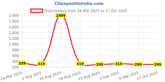 Good news! The current price of ₹299 is at its best ever level. Over the 206 day price history period, prices have ranged from ₹299 to ₹1,999, with an average of ₹524. The pricing shows high volatility with significant fluctuations, and the overall trend is favorable for consumers as prices are getting cheaper. In terms of recent activity, there have been 0 price changes this week, 0 this month, and 6 over the past year. If you need this product now, it's a reasonable time to buy as prices are stable, but you might want to monitor for potential better deals.