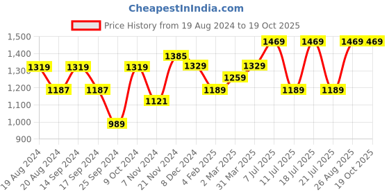 The current price is ₹1,469, which is ₹480 (48.5%) higher than the best price of ₹989 last seen on 25 Sep 2024. Over the 425 day price history period, prices have ranged from ₹989 to ₹1,469, with an average of ₹1,288. The pricing shows moderate volatility, but the overall trend is concerning as prices are getting more expensive. In terms of recent activity, there have been 0 price changes this week, 0 this month, and 10 over the past year. Consider waiting before making a purchase as prices are rising and better deals may be available later.