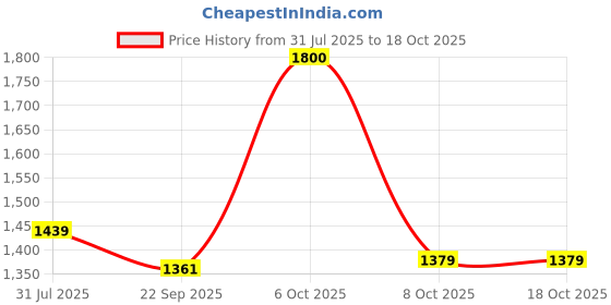 The current price is ₹1,379, which is ₹18 (1.3%) higher than the best price of ₹1,361 last seen on 22 Sep 2025. Over the 79 day price history period, prices have ranged from ₹1,361 to ₹1,800, with an average of ₹1,472. The pricing shows moderate volatility, with prices remaining relatively stable overall. In terms of recent activity, there have been 0 price changes this week, 2 this month, and 3 over the past year. The price direction is uncertain, so monitor the situation for a few more days before making a decision.